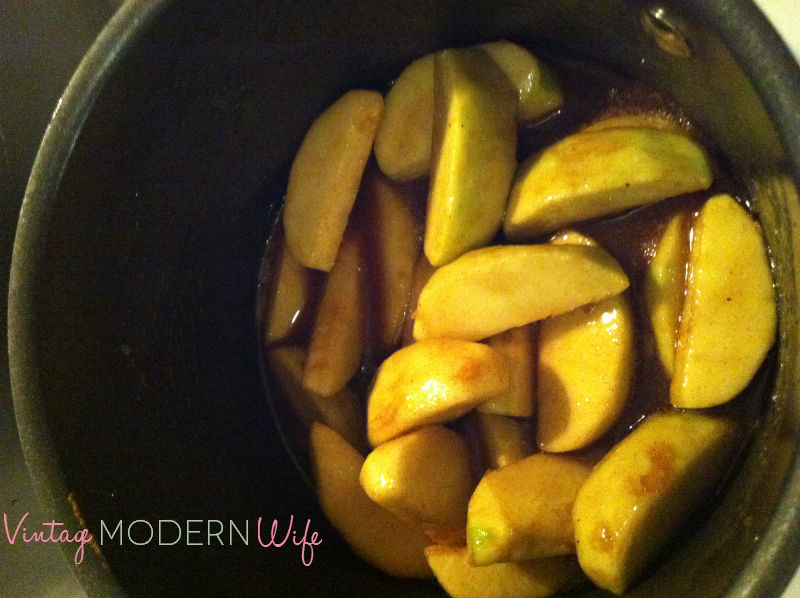 3. While apples are cooking, open your rolled pie crust(s) and lay it flat on a floured surface (I use my counter).