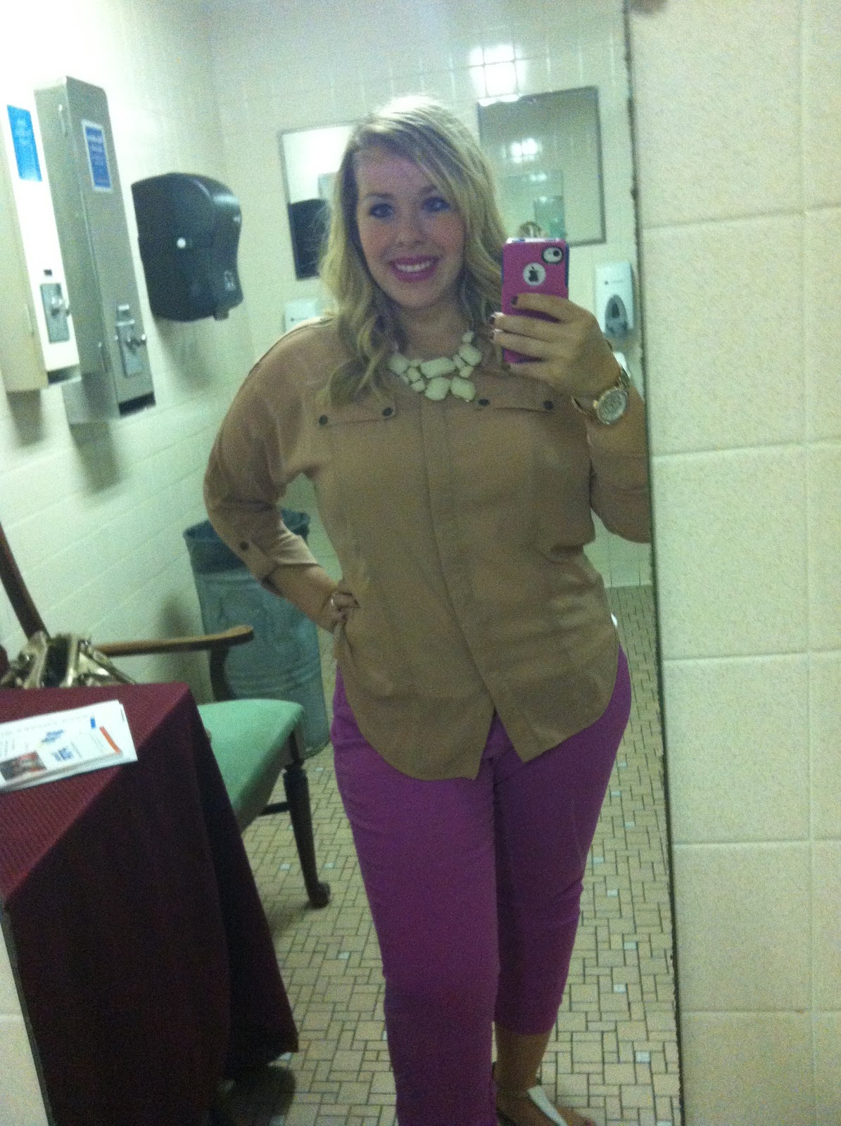 Ah the good ole work bathroom. In my defense, I hadn’t clocked in yet. Anyway, my pants are from Loft (clearance!), shirt from KikiLaRue, necklace from Forever 21, watch is Michael Kors, and shoes are Vera Wang for Kohl’s. All makeup is MAC (if you want colors just leave a comment and I’ll be happy to share).