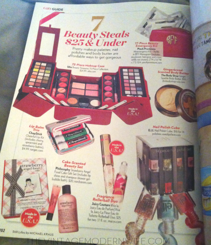 Of course my reading didn’t stop in the store. Even though I’m taking these magazines to New Mexico, who said you can’t read magazines twice? I went home and flipped to the “StyleWatch 100+ Gift Guide” because I’ve still got a couple people on my list that I just don’t know exactly what to get for them. This Gift Guide has over 100 gifts for those you love, AND they have tons of gift suggestions under $25. If that isn’t enough, InStyle ALSO has a 100 present gift guide! 200 gift ideas to explore? Sounds pretty good to me!