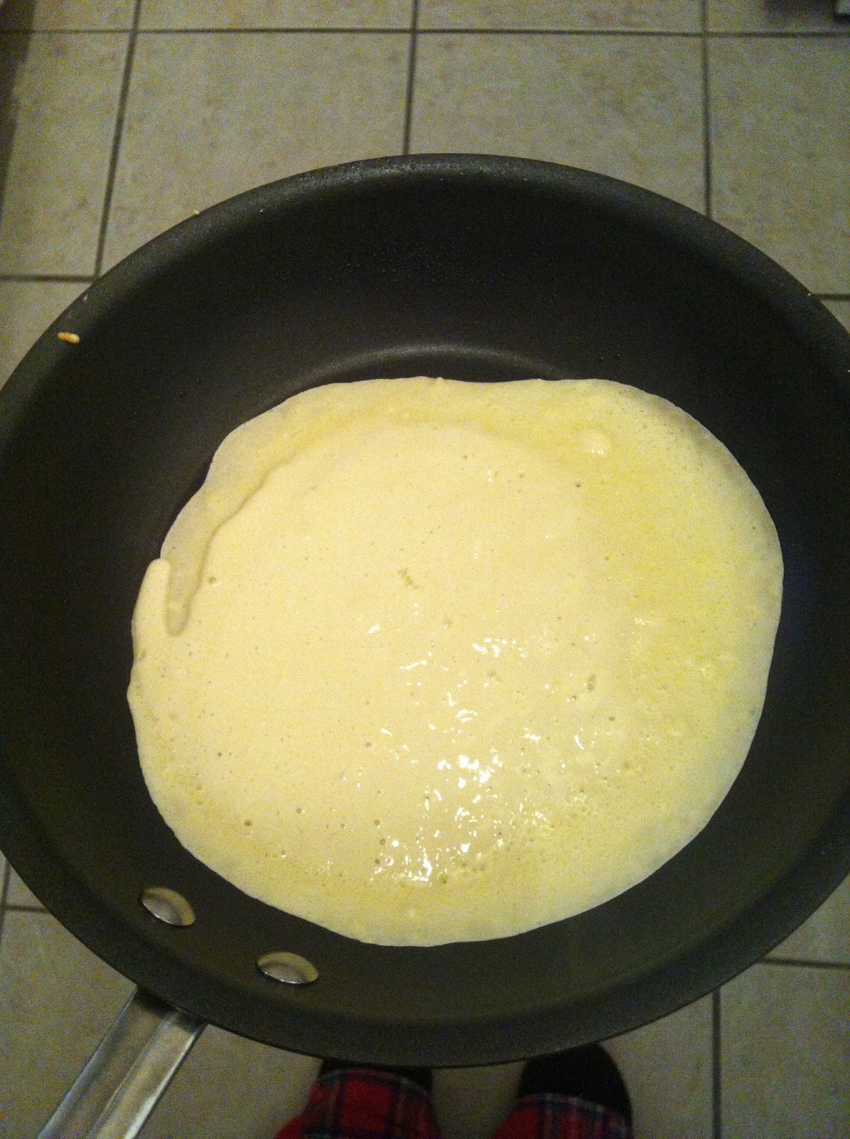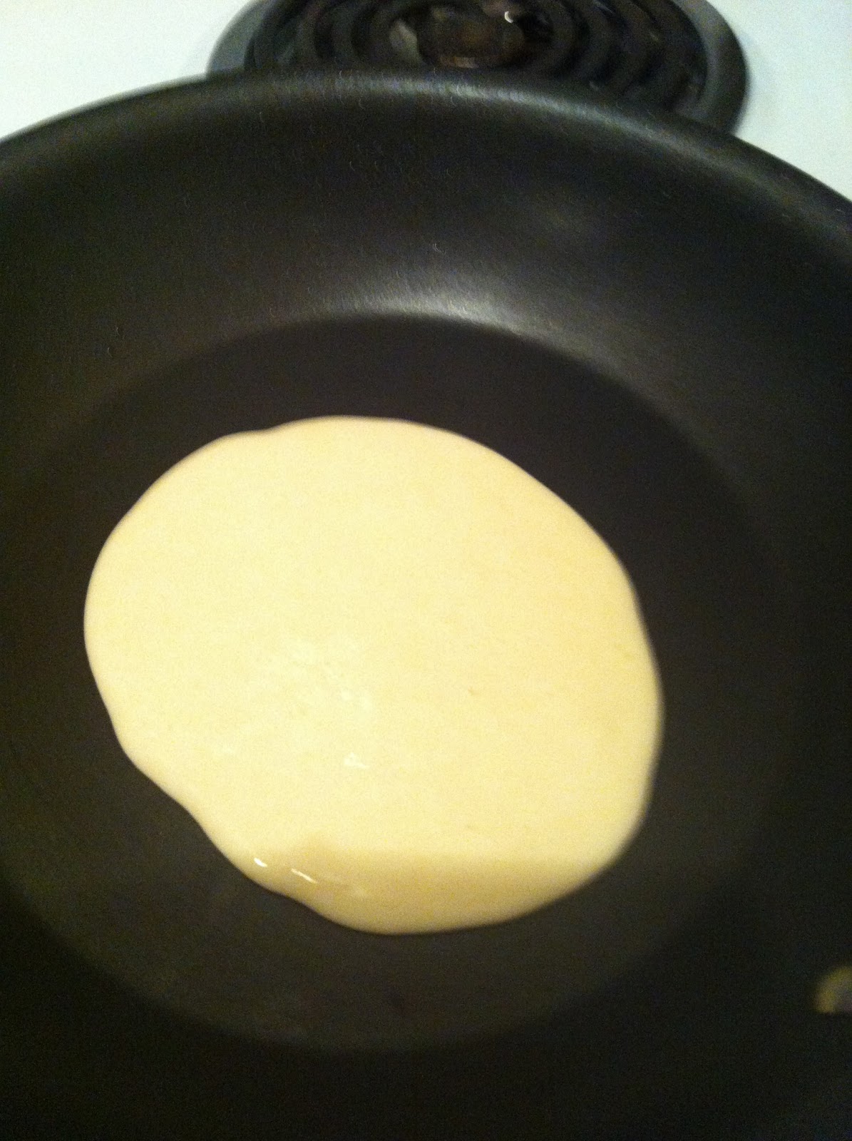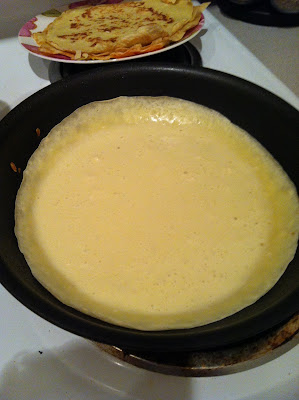 Heat a non-stick pan to medium/ medium-high. While pan is heating, mix ingredients in a large bowl. Your batter should be like a very runny pancake batter. Spray your pan lightly with cooking spray (Pam). Use a 1/3 cup measuring cup and scoop batter into it. Pour batter into middle of the pan. Once batter is in pan, pick up pan by the handle and use your wrist to swirl the batter to cover the surface of the pan (it should be a thin layer). Let cook until edges look see-through and cooked, and use spatula to flip (or if you have tough hands like me, just use your fingers). Cook for about 30-45 seconds more until crepe is golden and brown.
