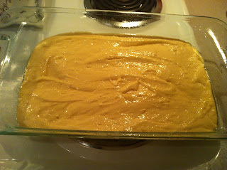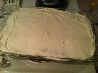 5. Take out your tub of cool whip and dumb the whole tub on top of the bananas and spread it out with a spatula.