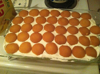 6. Take your vanilla wafers (don’t use the broken ones) and place them all over your cake in rows (or if you feel inclined to crush them all and just put a crumb topping, that’s cool too!).