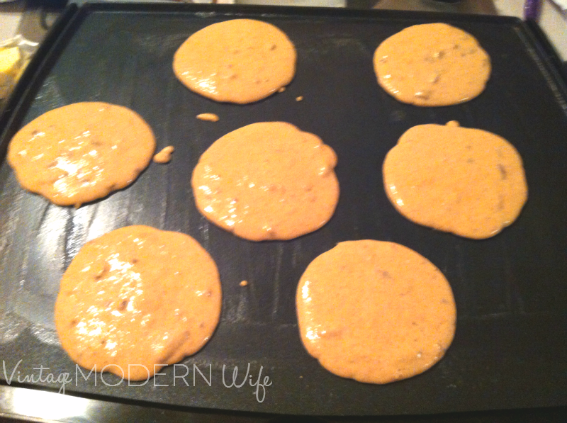 Step 6- Pour 1/4 cup pancake batter onto the skillet for each pancake. Cook until you see bubbles on top, flip, then cook til done. DO NOT SMASH YOUR PANCAKES. The key to good, fluffy pancakes is to flip, watch them cook, then flip. When you smash them, they lose their fluffiness.