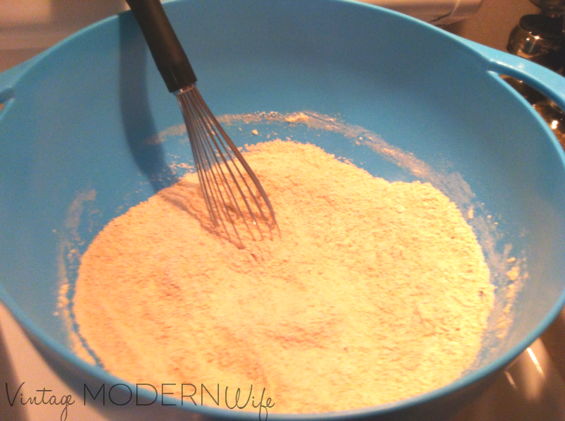 Step 1- Add flour, Splenda, baking powder, spices, 1/4 cup chopped pecans, and salt to a large mixing bowl. Whisk together to make sure ingredients are well mixed.