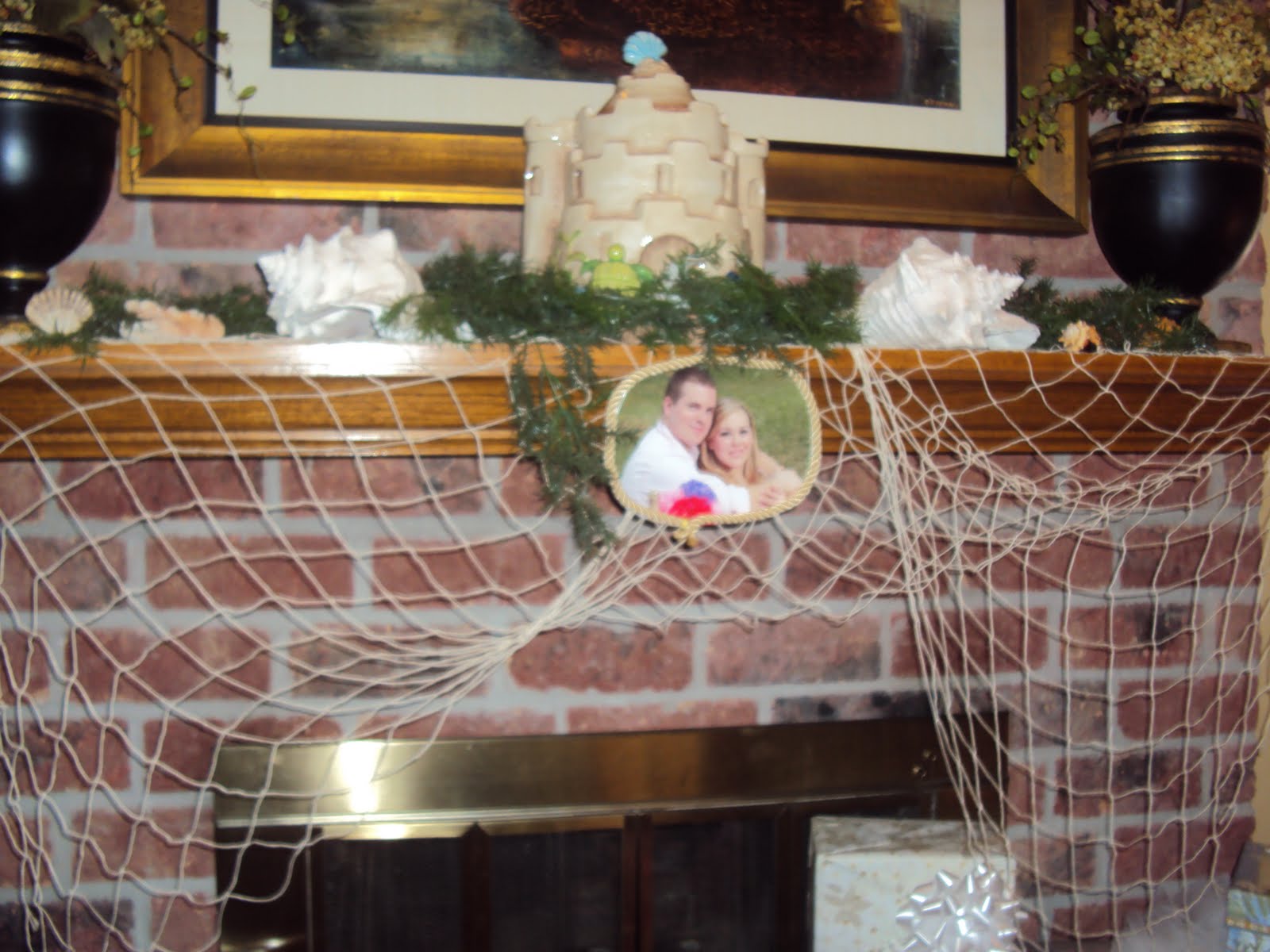aunt gloria got one of our engagement pics and wrapped it in rope and attached it to a net. how cute, right?